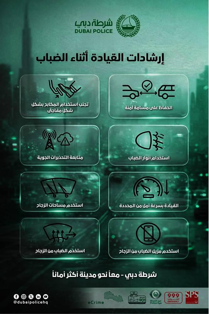 وأوضح أن الضباب الكثيف يؤدي إلى تدني مستوى الرؤية الأفقية على الطرق، الأمر الذي قد يتسبب في وقوع حوادث سيرٍ بين العشرات من المركبات مُخلفة وراءها خسائر بشرية ومادية، وذلك في حال لم يلتزم السائقون بالنصائح والإرشادات التي تطلقها الجهات المعنية في الدولة.