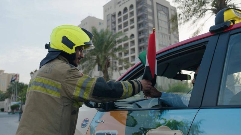 الدفاع المدني والإسعاف الوطني وشرطة عجمان توزع أعلام الإمارات على المواطنين والمقيمين