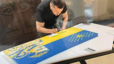 أوكرانيا 31 مارس 2023 بـ 100 ألف دولار.. مزاد لبيع لوحة بتوقيع الرئيس الأوكراني تعرض لوحة أصلية بتوقيع الرئيس الأوكراني فولوديمير زيلينسكي للبيع في مزاد، من المقرر أن تستخدم عائداته لصالح بلاده. وتبدأ المزايدة على اللوحة مقاس (101